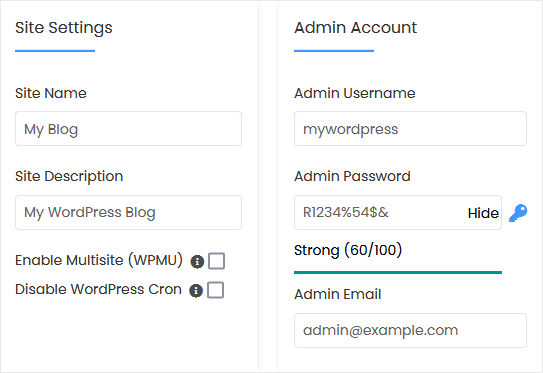 Note: Copy the admin username and password to Notepad. You will need those to access the admin area of your WordPress blog later.