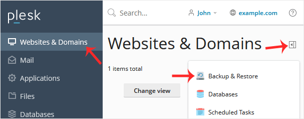 2. Go to Websites & Domains > Click on the Pull icon > Choose Backup & Restore.